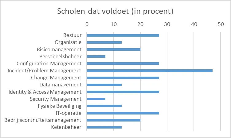 So where do schools stand now? Commissioned by the Digital Safe Education programme, research firm Dialogic conducted a baseline measurement using the Framework (see link). Of all the schools surveyed, a representative sample of 15 school boards, none yet met all requirements. The overview below also shows the compliance percentages per domain. With some optimism, Incident and Problem Management could be called a positive outlier, although that domain still scores below 50%. The results for the other domains are clearly lower.